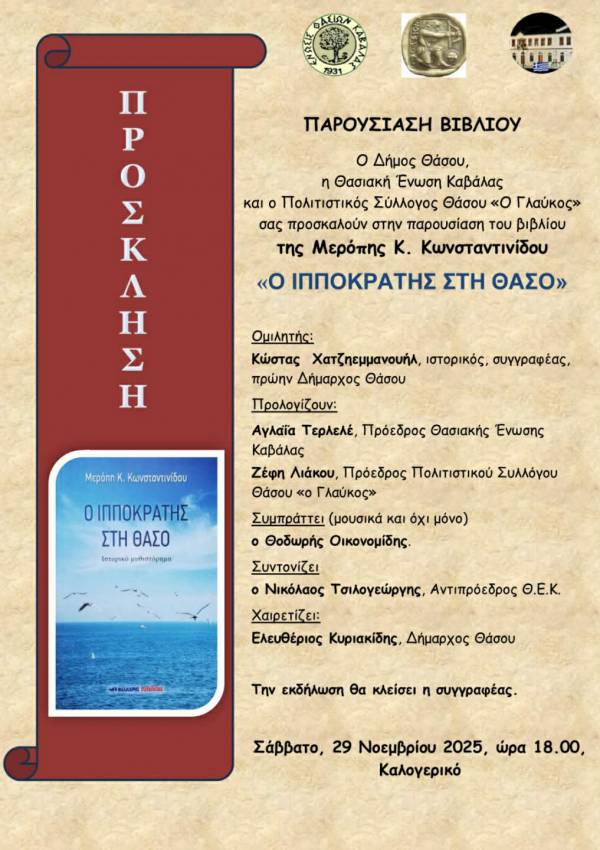 Ο Δήμος Θάσου, η Θασιακή Ένωση Καβάλας και ο Πολιτιστικός Σύλλογος Θάσου «Ο Γλαύκος» διοργανώνουν εκδήλωση για την παρουσίαση του βιβλίου της Μερόπης Κ. Κωνσταντινίδου «Ο Ιπποκράτης στη Θάσο» το Σάββατο, 29 Νοεμβρίου 2025, ώρα 18.00 στο Καλογερικό του Λιμένα.